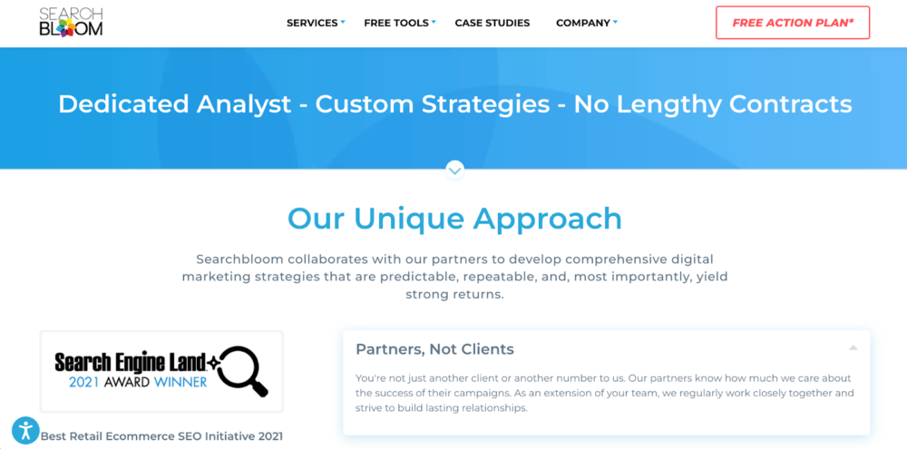 Searchbloom serves mid-sized businesses across e-commerce and lead generation. The agency rejects ranking reports that ignore conversion data. Every keyword target gets vetted for commercial intent.
